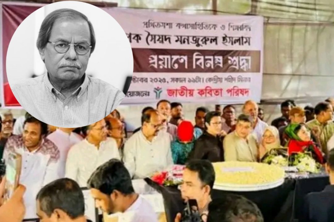 বরেণ্য শিক্ষাবিদ ও সাহিত্যিক, ঢাকা বিশ্ববিদ্যালয়ের ইংরেজি বিভাগের ইমেরিটাস অধ্যাপক সৈয়দ মনজুরুল ইসলামের মরদেহ সর্বসাধারণের শ্রদ্ধা নিবেদনের জন্য কেন্দ্রীয় শহিদ মিনারে রাখা হয়েছে। বৃষ্টি উপেক্ষা করে শ্রদ্ধা জানাচ্ছেন সর্বস্তরের মানুষ।